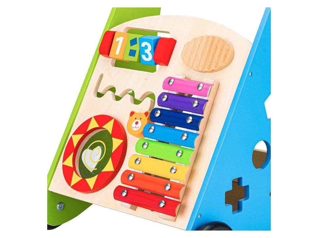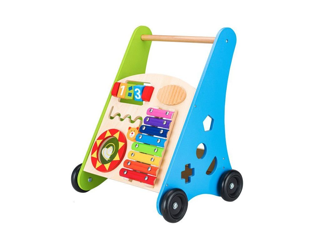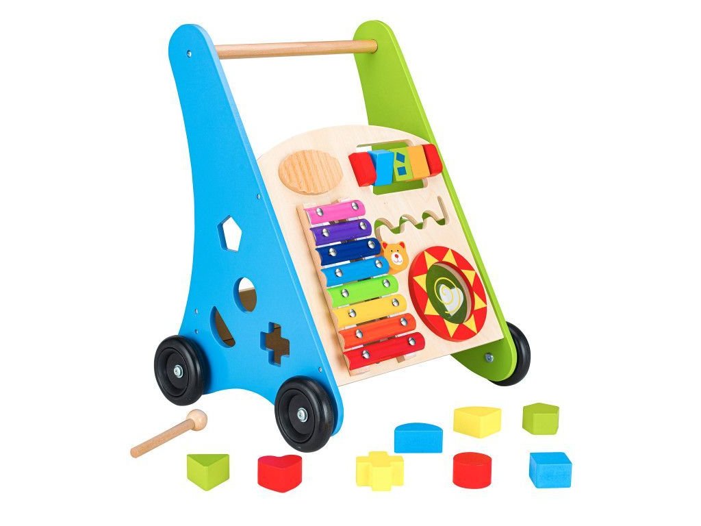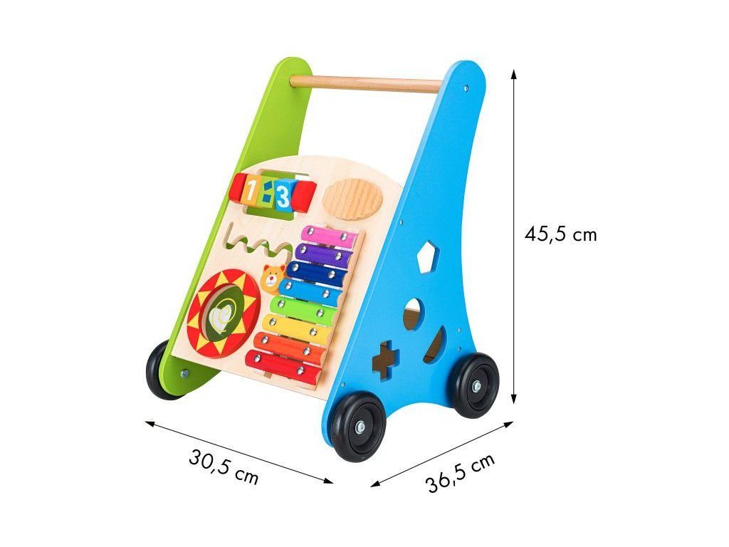 Dětské dřevěné chodítko Ecotoys Funny Walker je ideální hračkou pro děti již od prvních krůčků. Je vyrobeno ze dřeva tak, že nemá žádné ostré hrany a je pro dítě absolutně bezpečné. Obsahuje spoustu zábavných a barevných prvků jako jsou různé pohyblivé kostičky s čísly, bubínek, hrající cimbálky, labyrint a další. Slouží také jako úložný prostor pro hračky a dítě je tak může mít vždy po ruce. Kolečka chodítka jsou vyrobeny z protiskluzového materiálu, který nepoškrábe podlahu. Součástí balení je 8 barevných kostek, které lze prohazovat otvory na boční straně chodítka a palička pro hru na cimbálky.