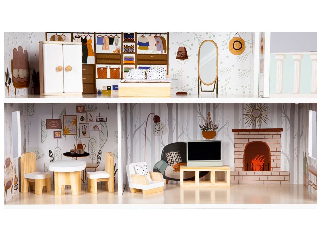Domeček pro panenky rezidence Emma. Celý domeček má 3 nezávislé úrovně, ve kterých je celkem 5 pokojů a balkón - vše imituje dokonale skutečný bytový dům. Každý pokoj byl dokončen v jiném stylu, přizpůsoben byl dekor a nábytek charakteru a účelu místnosti. Součástí soupravy je také sada 10 ks dřevěného nábytku, který lze bez omezení přesunovat. Každý kus nábytku je vyroben ručně, s velkou pozorností k detailu a nejvyšší kvalitě provedení, bylo také dbáno na odstranění ostrých hran, které jsou zásadní pro bezpečnost Vašeho dítěte. Domeček Emma je nepochybně nejlepší dárek, který můžete dát Vašemu dítěti! Každá dívka sní o takovém domečku! Rezidence bude vypadat dobře nejen v dětském pokoji, ale i v obývacím pokoji, což povzbudí potěšení všech členů domácnosti. Nemusíte se starat o sestavení domu - jasná příručka s obrázky a číslování všech prvků Vám umožní rychle a efektivně sestavit dům. K montáži musíte použít křížový šroubovák, dům sestavíte asi za 60 minut.