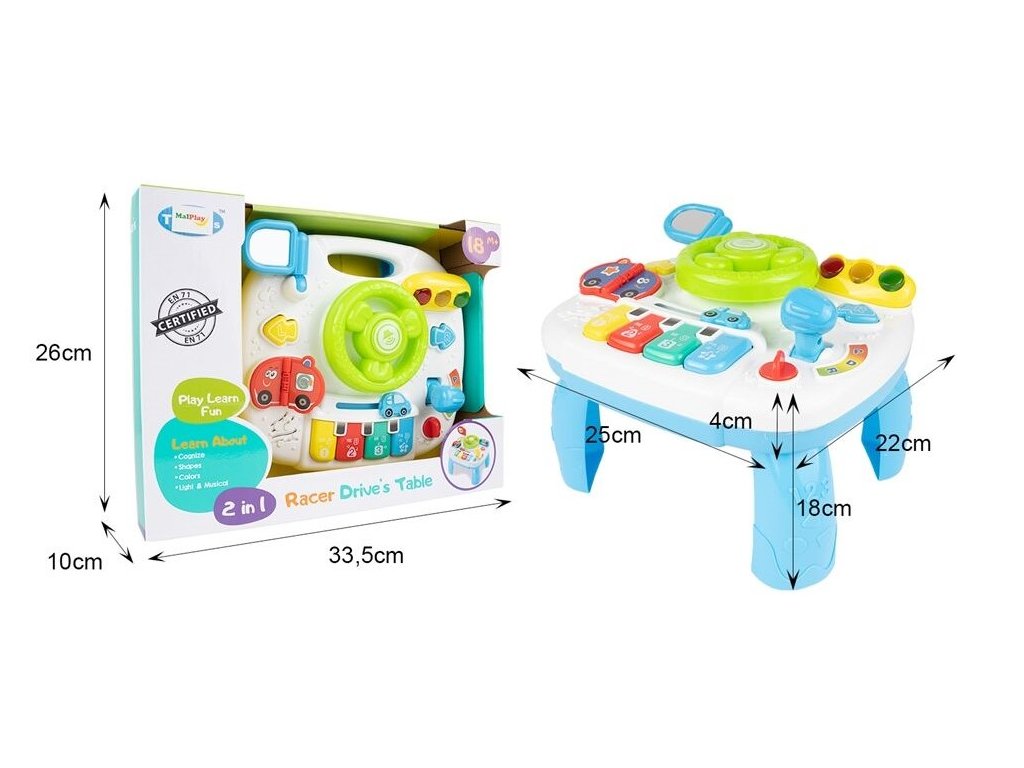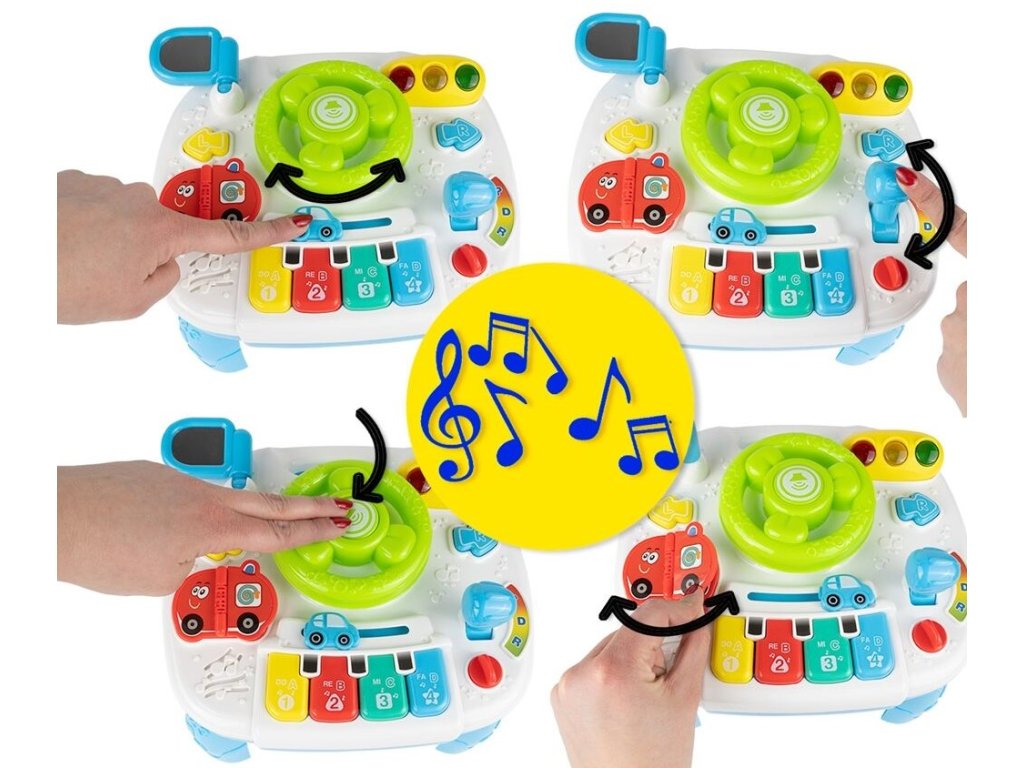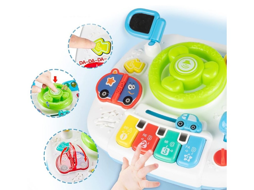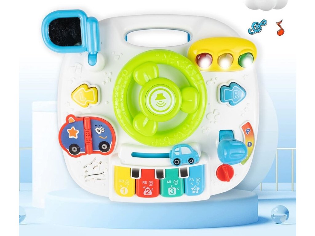 Dětský multifunkční stoleček 2v1 Drive Table určen pro ty nejmenší děti. Po vyjmutí nohou stolu může dítě hrát s panelem samotným nebo ho můžete zavěsit na dětskou postýlku nabo kočárek. Hrací deska je pokryta příjemnými barvami. Tvary stolečku jsou velmi jednoduché a zaoblené pro maximální bezpečnost dítěte. Děti se díky všem smyslům seznamují s okolním světem, a proto je důležité neustále upoutávat jejich pozornost správným a příjemným způsobem - nejlépe veselou hrou. Barevný stolek zaujme zvukovými a barevnými efekty každé dítě. Stoleček má dvoustupňovou kontrolu hlasitosti, díky níž může být hračka zcela zticha, což bude užitečné během večerní hry. Velkou výhodou stolu je kombinace všech aktivit se zvukovými a světelnými efekty, které zajímají a povzbuzují všechny děti k hraní. Tento stolek bude perfektní jak pro chlapce, tak pro dívku - hračky, které lze přesunout, jistě zaujmou každé dítě.