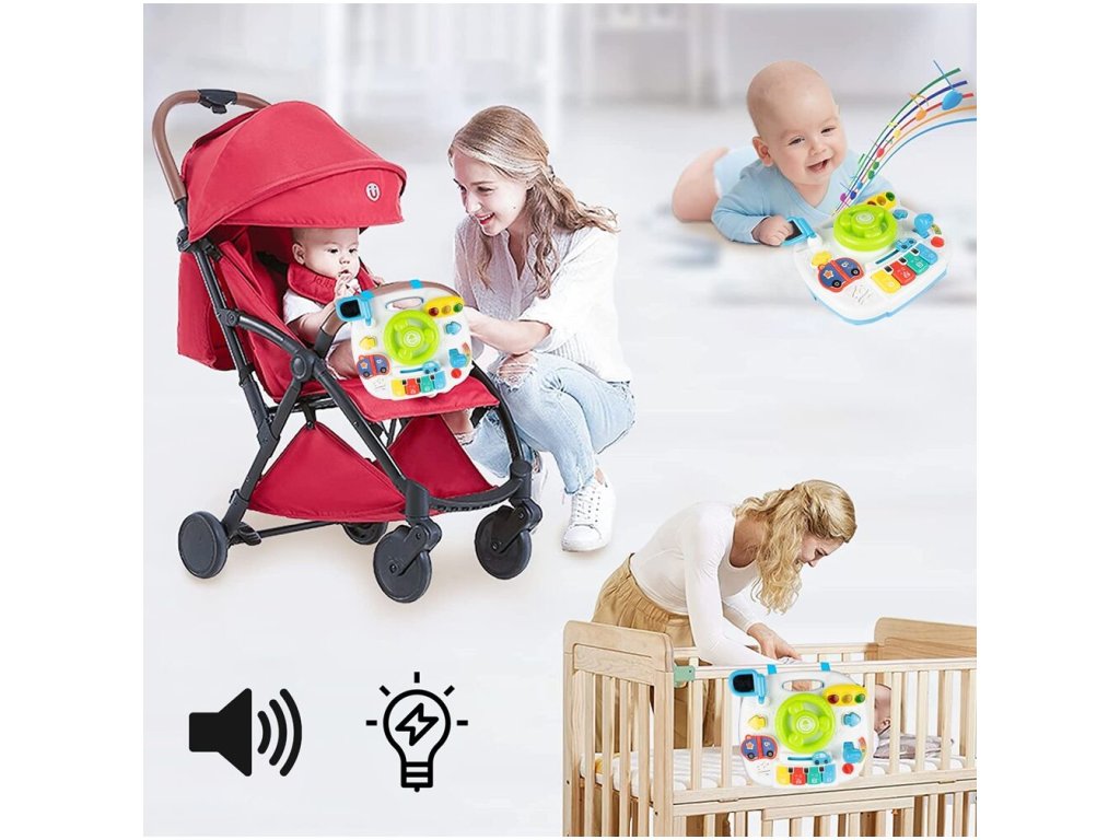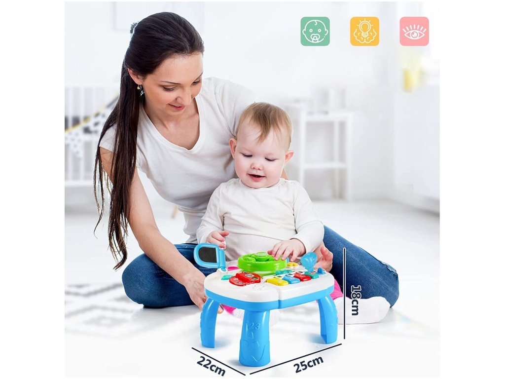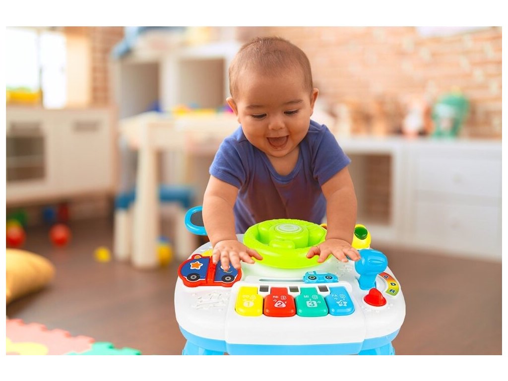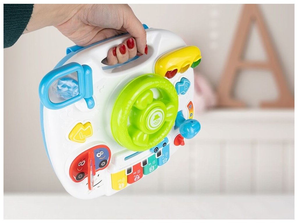 Dětský multifunkční stoleček 2v1 Drive Table určen pro ty nejmenší děti. Po vyjmutí nohou stolu může dítě hrát s panelem samotným nebo ho můžete zavěsit na dětskou postýlku nabo kočárek. Hrací deska je pokryta příjemnými barvami. Tvary stolečku jsou velmi jednoduché a zaoblené pro maximální bezpečnost dítěte. Děti se díky všem smyslům seznamují s okolním světem, a proto je důležité neustále upoutávat jejich pozornost správným a příjemným způsobem - nejlépe veselou hrou. Barevný stolek zaujme zvukovými a barevnými efekty každé dítě. Stoleček má dvoustupňovou kontrolu hlasitosti, díky níž může být hračka zcela zticha, což bude užitečné během večerní hry. Velkou výhodou stolu je kombinace všech aktivit se zvukovými a světelnými efekty, které zajímají a povzbuzují všechny děti k hraní. Tento stolek bude perfektní jak pro chlapce, tak pro dívku - hračky, které lze přesunout, jistě zaujmou každé dítě.